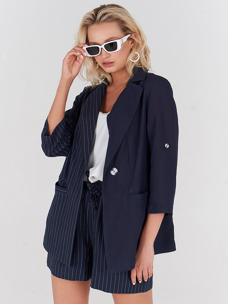 - Жакет прямого крою. Класичний фасон жіночий жакет. Він не ускладнює образ, а надає йому більше елегантності. Відмінно поєднується з укороченими брюками, у комплекті ці речі створять чудовий образ у діловому стилі.